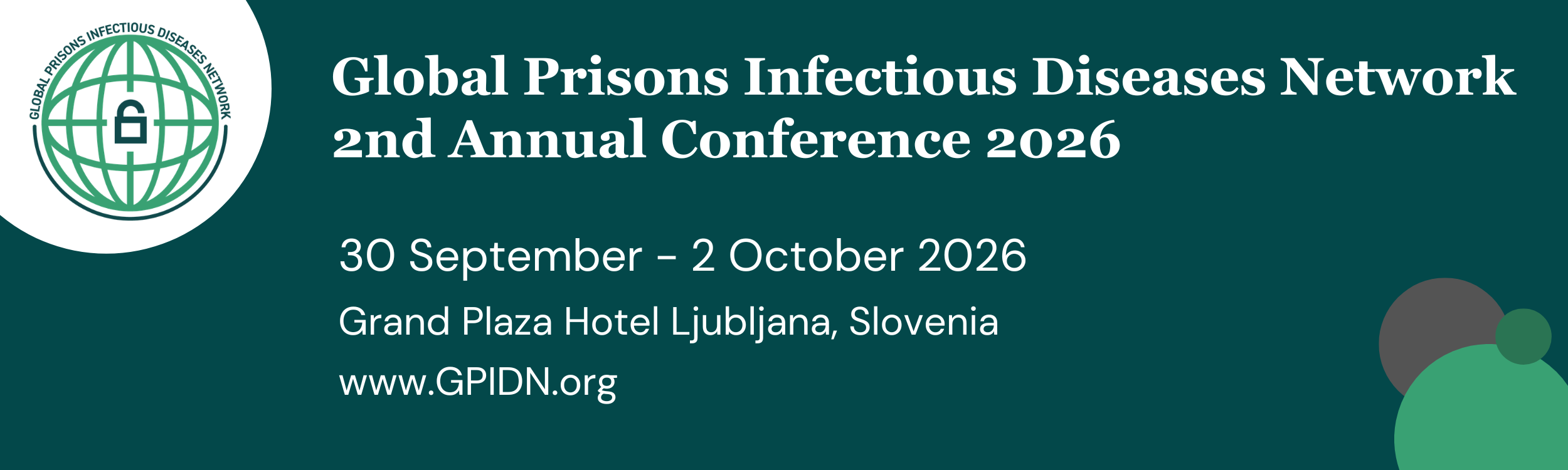Welcome to the registration site for the Global Prisons Infectious Diseases Network Conference 2026 (GPIDN26), taking place at the Grand Plaza Hotel Ljubljana, Slovenia from Wednesday 30 September - Friday 2 October 2026. The main conference days are Wednesday and Thursday. Friday may include optional prison site visits and/or other meetings/workshops.